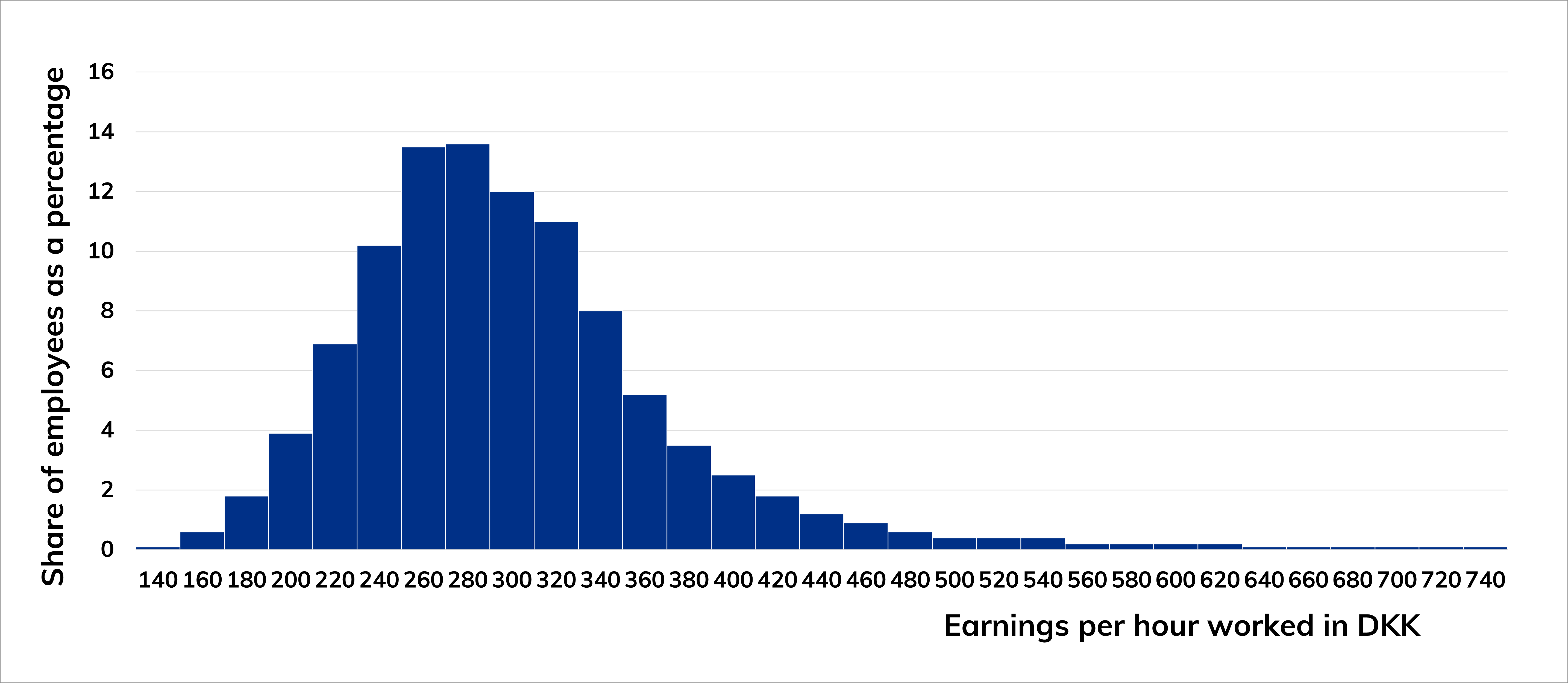 The chart shows that a quarter of employees receive an overall payment of less than DKK 258,6 per hour worked. The median is DKK 294,27. The most highly paid quarter receive an overall payment of more than DKK 335,33.