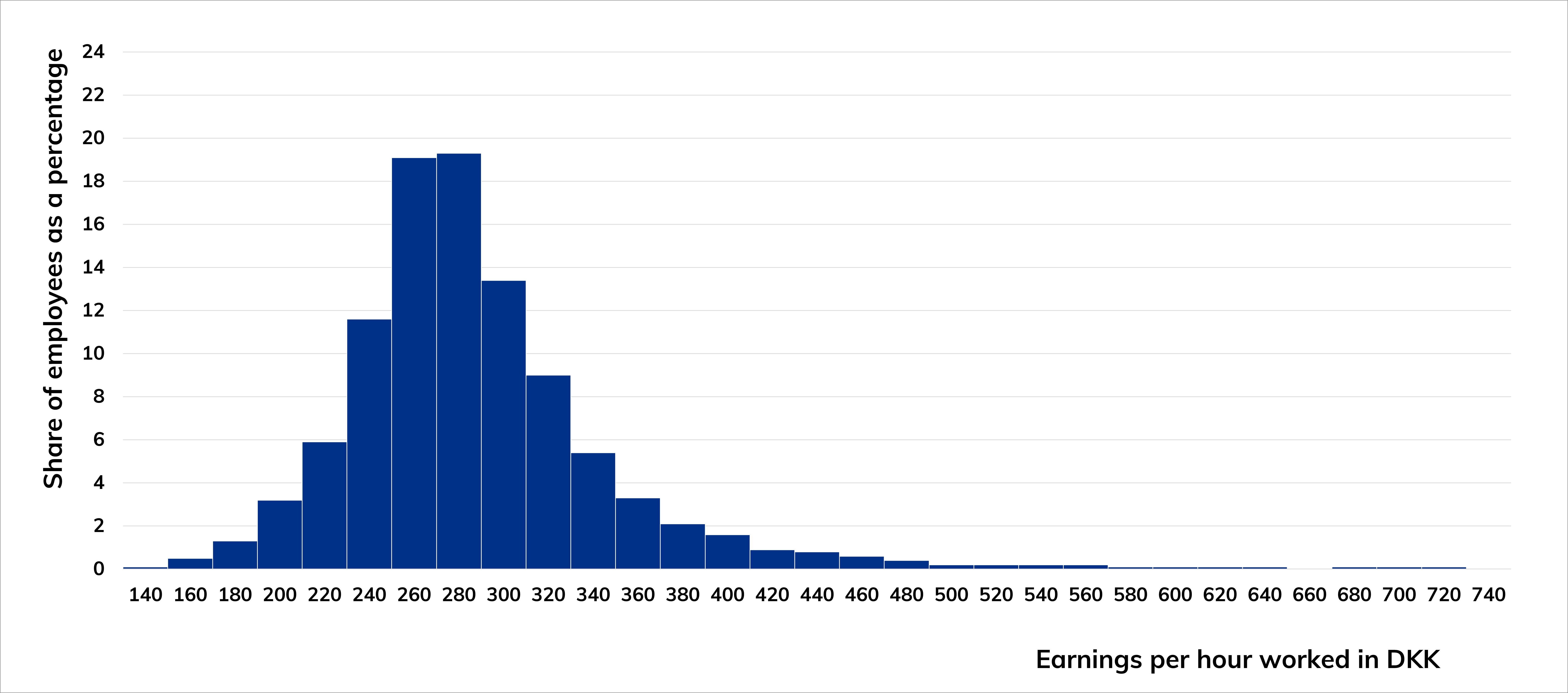 The chart shows that a quarter of employees receive an overall payment of less than DKK 261,25 per hour worked. The median is DKK 285,15. The most highly paid quarter receive an overall payment of more than DKK 317,18.